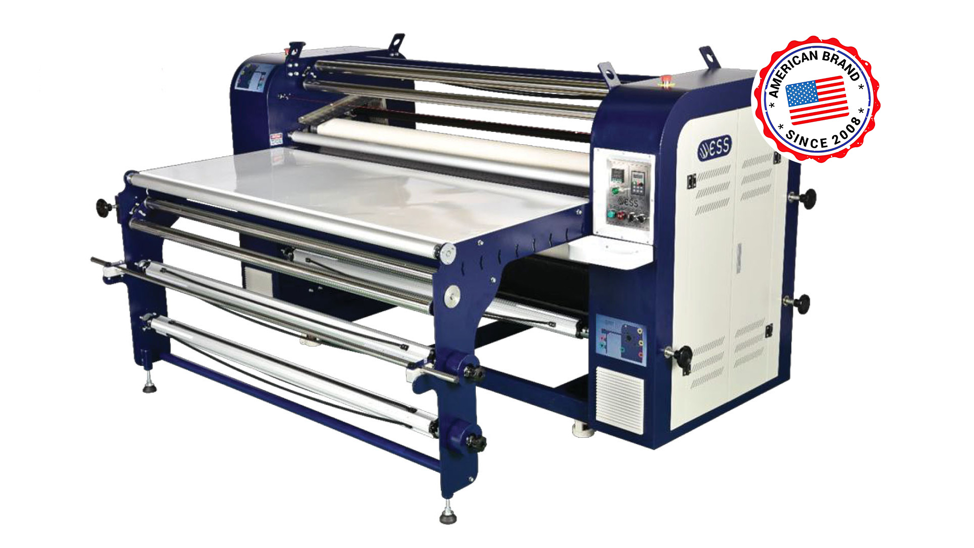 The display machine is new improved model. The designer and technicians made thousands of trials to decide the present appearance. Blue frame with dark grey doors, pure blue table coordinate the frame, which uniquely defined in the market. The color contrast fully display the transfer fabric. And PLC control make system detailed and increase cost performance.Â
